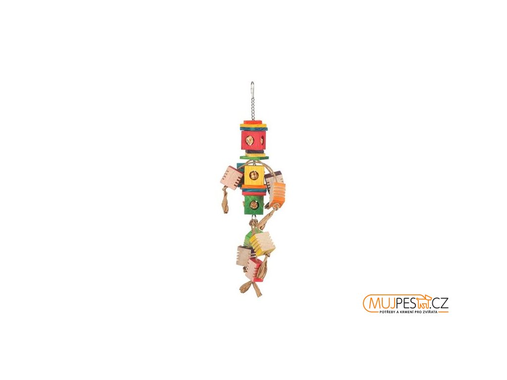 Pestrá závěsná hračka pro malé papoušky podporuje zvídavost a přirozené hledání potravy. Barevné dřevěné bloky s otvory jsou ideální pro ukrývání pamlsků. Kroucený papír a hravé provedení stimulují smysly. Hračka je vyrobena z přírodních a bezpečných materiálů a snadno se zavěšuje pomocí kovové karabinky, která je na konci řetízku z nerezové oceli.
