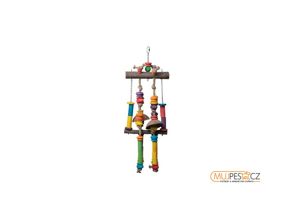 Závěsné hřiště pro malé, střední i velké papoušky má barevné dřevěné prvky, odolné bavlněné lano a prvky z kokosového ořechu. Hračku lze zavěsit svisle nebo pod úhlem a díky čtyřem úchytům snadno přizpůsobit prostoru klece či voliéry. Je vyrobena z borovicového a topolového dřeva, kokosové skořápky, přírodně barvená, s bezpečným nerezovým řetízkem a kovovou karabinkou. Všechny použité materiály jsou netoxické a bezpečné pro papoušky.