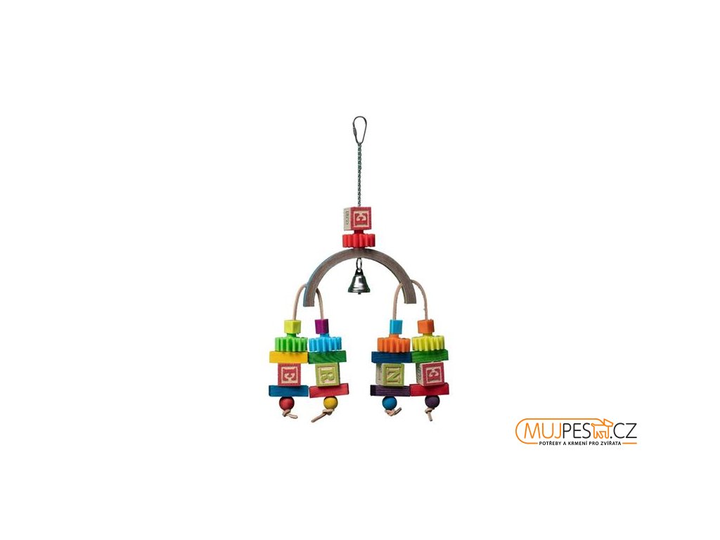 Barevná hračka nabízí rozmanité možnosti zábavy malým papouškům. Kombinace barevných dřevěných prvků, papírových provázků, zvonečku, kůže a papíru povzbuzuje ke šplhání, ozobávání i prozkoumávání. Hračka je vybavena nerezovým řetízkem s kovovou karabinkou a lze ji snadno zavěsit do klece nebo voliéry. Vyrobena z borovicového dřeva, papíru a přírodně barvených materiálů. Všechny použité materiály jsou netoxické a bezpečné pro papoušky.