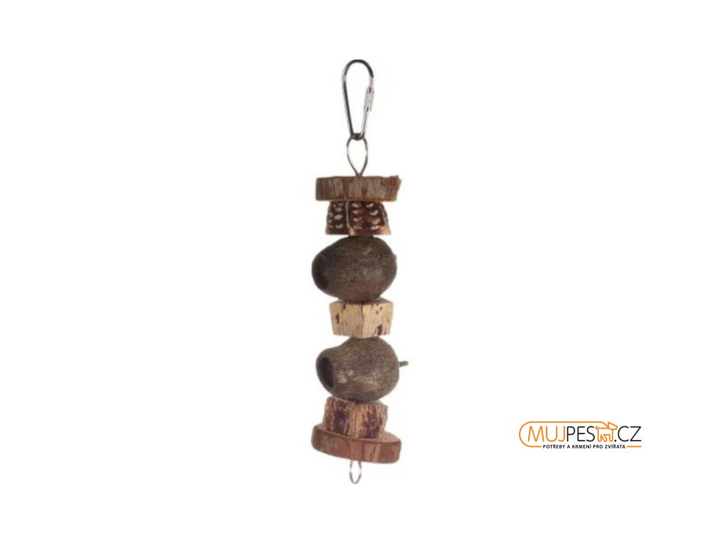 Hračka z přírodních materiálů pro zabavení papoušků v kleci. Kousky dřeva, korálky a oříšky jsou ideální pro oštipování a žvýkání. Hračka má kovový závěsný systém pro snadné uchycení ke kleci.