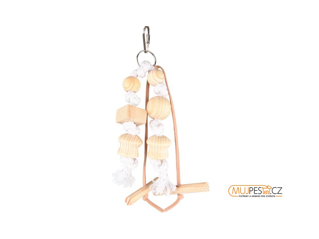 Flamingo Appi Blocks Stick je závěsná hračka s kostkami a tyčinkami pro malé až středně velké papoušky. Uspokojí jejich zvědavost, zažene nudu a pomůže je udržet v dobré fyzické i psychické kondici. Je obzvlášť odolná vůči opotřebení. Jednotlivé části hračky mohou ptáci oštipovat a tím si obrušovat svůj zobák. Na kovovém kroužku jsou na bavlněném lanu a pásce navěšeny rozmanité prvky ze dřeva (kostky, korálky, válečky). Hračku snadno připnete ke kleci či voliéře pomocí kovové karabinky.
