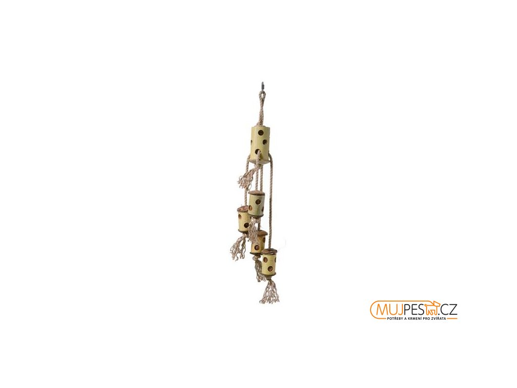 Ručně vyráběná závěsná hračka z přírodních materiálů je ideální pro středně velké papoušky. Duté bambusové trubičky lze využít k ukrytí pamlsků a podpořit tak přirozené chování, jako je šplhání, ozobávání, hledání potravy a houpání. Hračka je vyrobena z bambusu, kokosových vláken a jutového provázku, bez použití barviv. Bezpečná kovová karabinka umožňuje snadné zavěšení do klece nebo voliéry. Všechny použité materiály jsou netoxické a bezpečné.