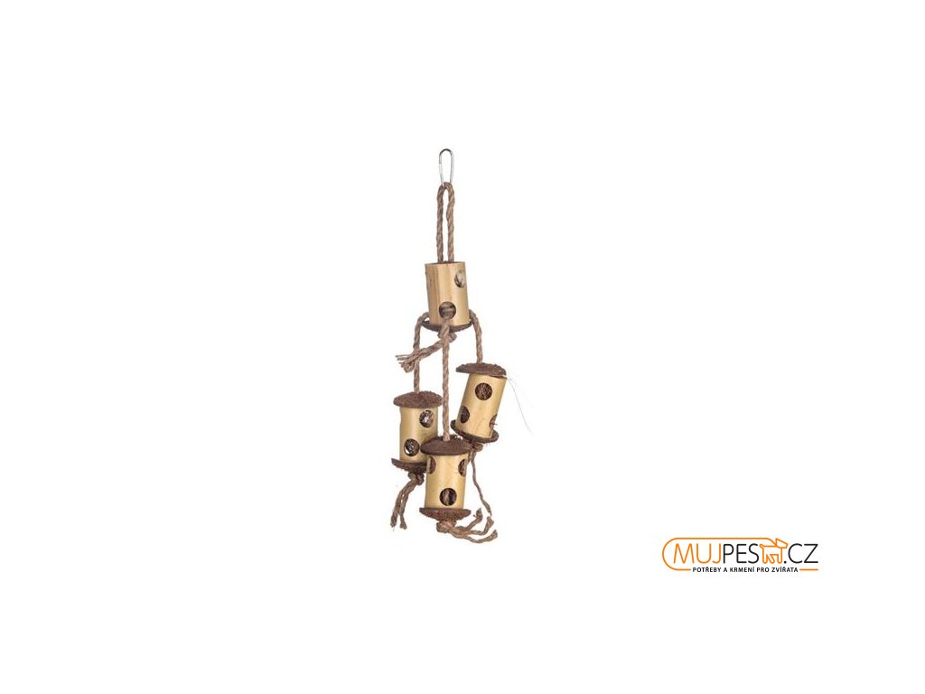 Ručně vyráběná závěsná hračka z přírodních materiálů je ideální pro malé papoušky. Duté bambusové trubičky lze využít k ukrytí pamlsků a podpořit tak přirozen chování, jako je šplhání, ozobávání, hledání potravy a houpání. Hračka je vyrobena z bambusu, kokosových vláken a jutového provázku, bez použití barviv. Bezpečná kovová karabinka umožňuje snadné zavěšení do klece nebo voliéry. Všechny použité materiály jsou netoxické a bezpečné.