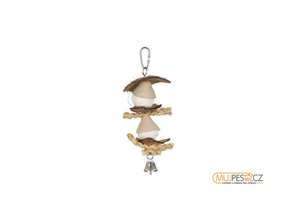 Přírodní závěsná hračka z kokosových skořápek, kukuřičného listí a kovového drátu je vhodná pro různé druhy papoušků. Podporuje šplhání, ozobávání a zkoumání. Díky kovové karabince ji lze snadno zavěsit do klece nebo voliéry. Součástí hračky je také zvoneček. Použité materiály jsou bezpečné a přizpůsobené potřebám papoušků.