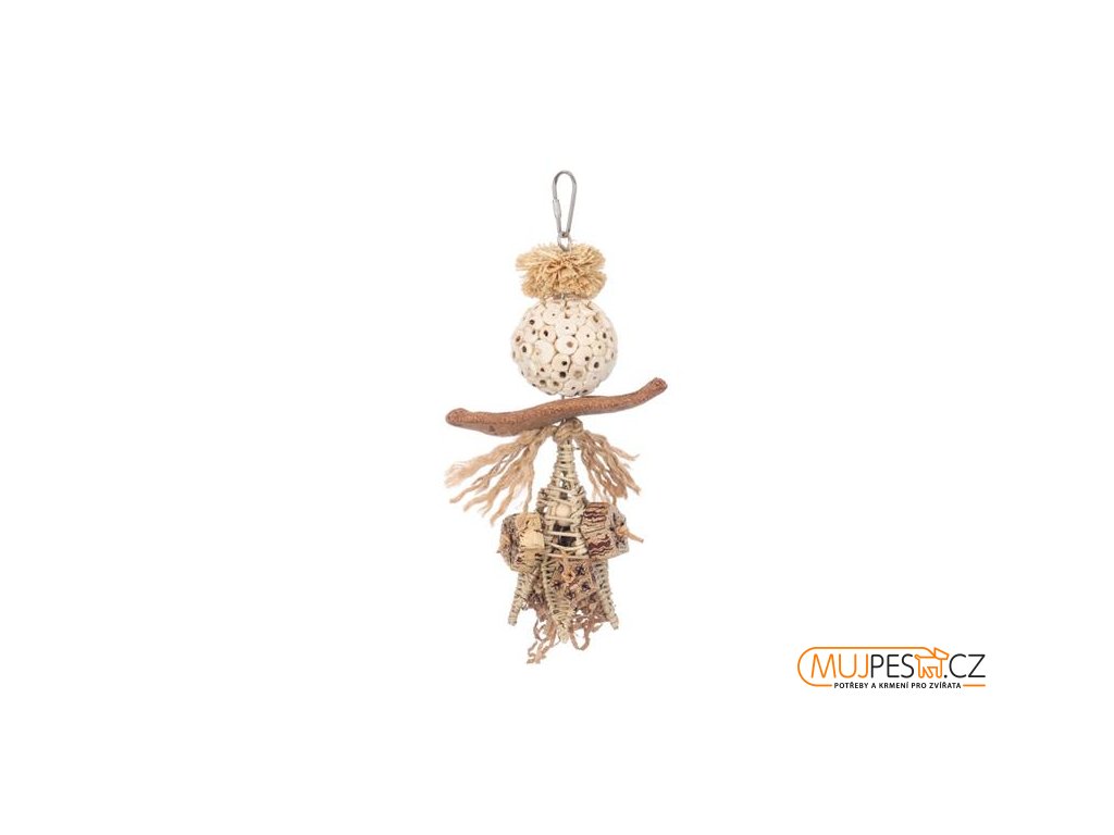 Závěsná hračka z dřeva sola, kukuřičného listí, vrbových větviček, lusků mahagonu, jutového provazu a kovového drátu je vhodná pro různé druhy papoušků. Podporuje šplhání, ozobávání a aktivní hru. Díky kovové karabince ji lze snadno zavěsit do klece nebo voliéry. Použité přírodní materiály jsou bezpečné a přizpůsobené potřebám ptáků.
