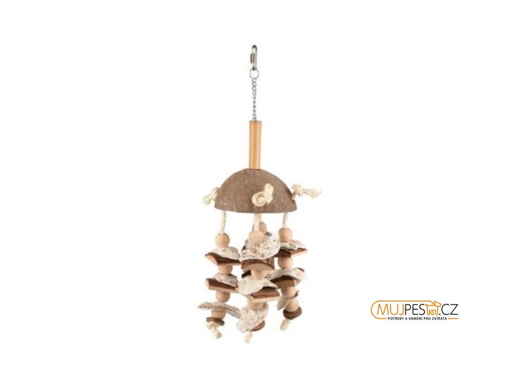 Hračka z přírodních materiálů pro zabavení papoušků v kleci. Kousky dřeva, kokos, lastury a juta jsou ideální pro oštipování a žvýkání. Hračka má kovový závěsný systém pro snadné uchycení ke kleci.
