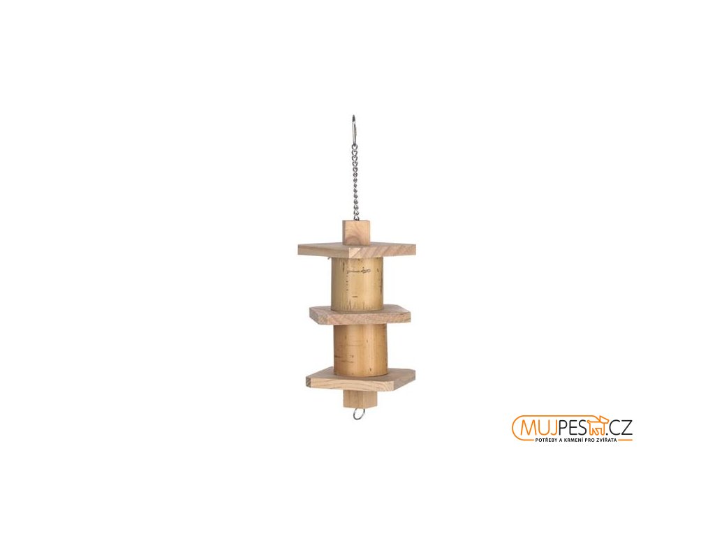 Závěsná hračka z borovicového dřeva a bambusu je vhodná pro různé druhy papoušků. Do otvorů ve dřevě lze ukrýt pamlsky a podpořit tak přirozené hledání potravy, ozobávání a zkoumání. Hračka stimuluje mentální i fyzickou aktivitu a pomáhá zahnat nudu. Díky nerezovému řetízku s kovovou karabinkou ji lze snadno zavěsit do klece nebo voliéry. Vyrobena z odolných a bezpečných materiálů.
