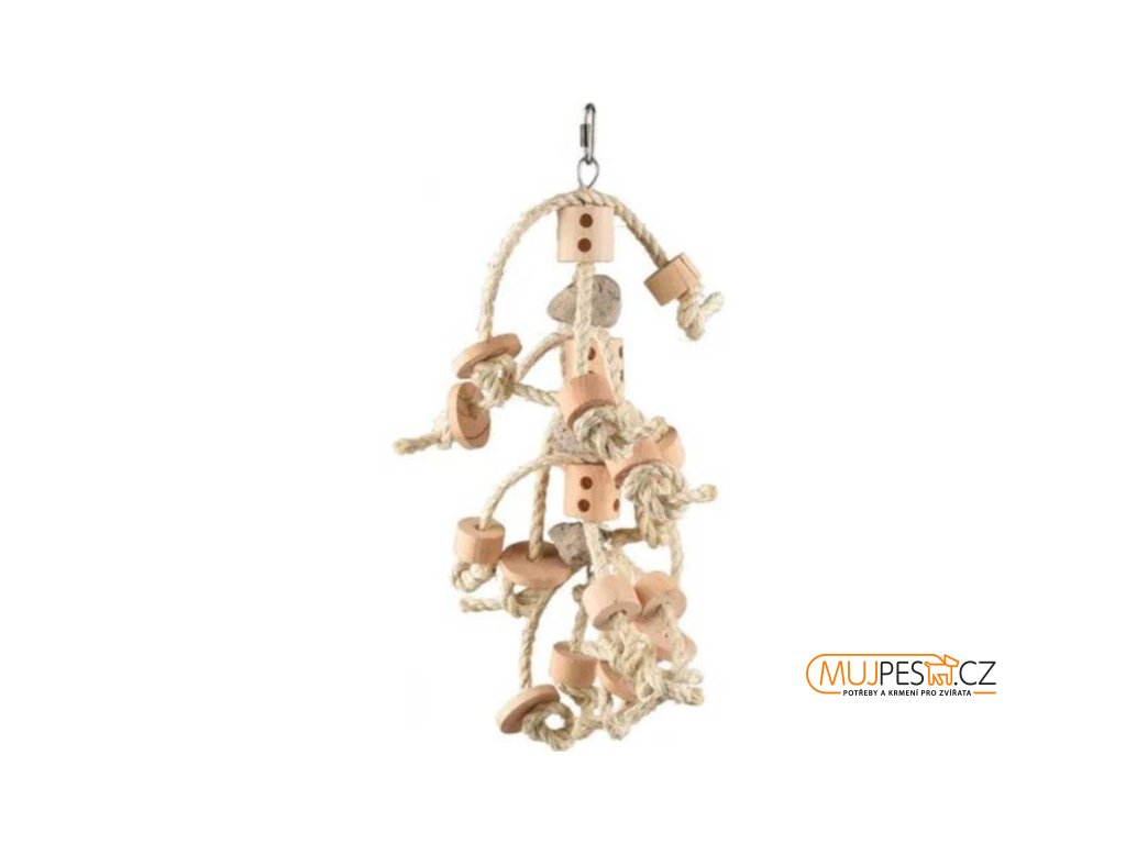 Hračka z přírodních materiálů pro zabavení papoušků v kleci. Kousky dřeva a uzlíky ze sisalu jsou ideální pro oštipování a žvýkání. Hračka má kovový závěsný systém pro snadné uchycení ke kleci.