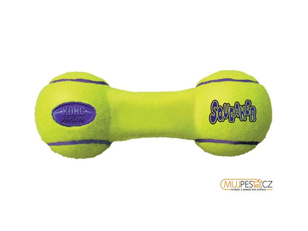Hračky pro psy originál AIR KONG SQUEAKER od zakladatele anglické psí školy doktora Mugforda se vyrábějí v továrně na tenisové míčky. Kvalitní kaučuková směs spolu s navulkanizovaným plstnatým povrchem propůjčují těmto zajímavým hračkám pro psy zvýšenou životnost. Hračka Air dog činka Kong je odměňovací hračka, pomocník při výcviku poslušnosti psa a ideální pro aportovací trénink na souši i na vodě nebo pro volnou koupací zábavu psů. Uvnitř hraček je kvalitní pískátko, které motivuje psa ke hře. Povrch hračky je ozdoben výšivku SQUEAKER.