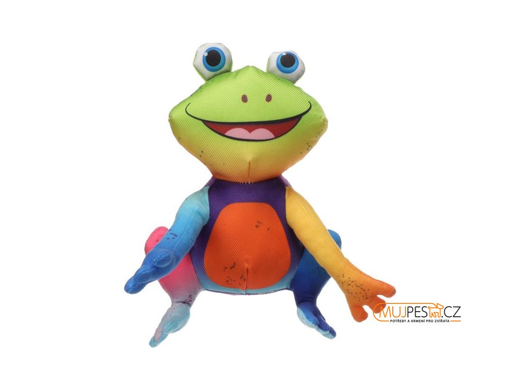 Pestrobarevná hračka pro psy ve tvaru žáby je vyrobená z měkké tkaniny a plyše. Pro ještě větší potěšení ze hry píská a šustí.