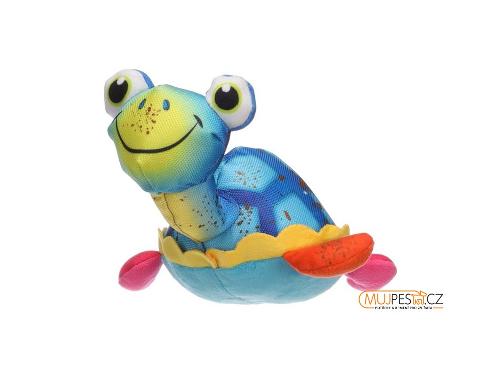 Pestrobarevná hračka pro psy ve tvaru želvy je vyrobená z měkké tkaniny a plyše. Pro ještě větší potěšení ze hry píská a šustí.