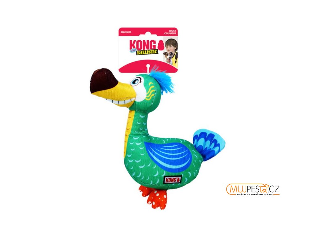 Veselý různobarevný pták Dodo pro psy KONG Ballistic Vibez je vyroben z mimořádně pevného materiálu, který odolá drtivému stisku čelistí i zuřivému lomcování při přetahování. Hračku lze ale s úspěchem využít například při nácviku aportování, zatímco huňatá chocholka, dlouhý zobák a plochý ocásek i nožky svádí spíše k okusování a mazlení. Pták navíc vydává pískavé zvuky, které stupňují zvědavost a vzrušení a podněcují přirozené psí instinkty. Díky dlouhému krku a zobáku lze hračku snadněji přenášet i uchopovat, měkké tělo je příjemné na okusování a šetrné k zubům i dásním. Svými rozměry (velikost M/L) vyhovuje psům středních a velkých plemen.