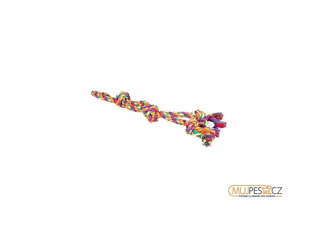 Odolné bavlněné přetahovadlo pro psy je spletené z pevných barevných provázků s uzly a na jedné straně je zakončené okem pro snadné uchopení. Hodí se pro přetahování, aportování i kousání. Bavlněné provázky během hry přirozeně čistí chrup a přispívají tak ke zdraví zubů a dásní.