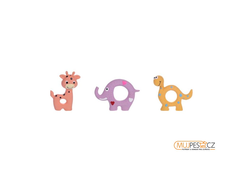 Vinylová hračka pro psy s motivem zvířátek (žirafa, slon, dinosaurus). Hračka obsahuje pískátko pro aktivnější hru domácího mazlíčka.