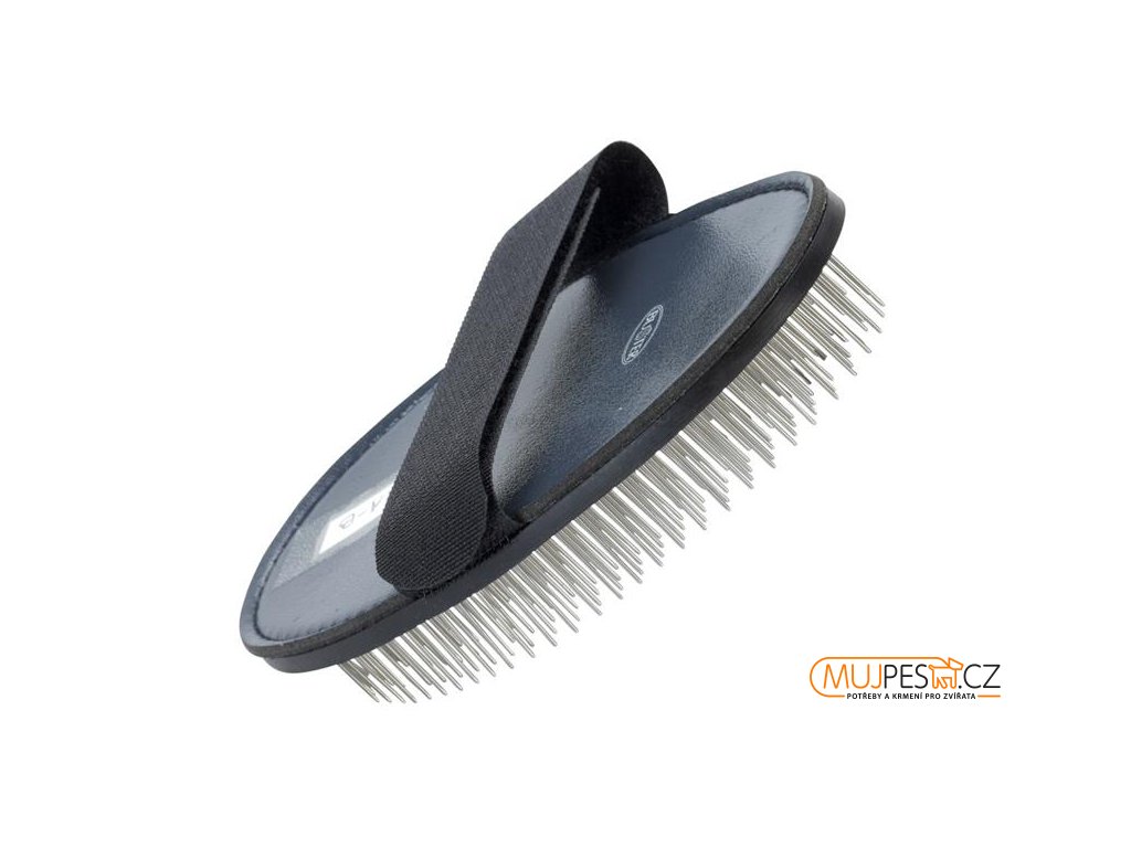 Kartáč Buster od firmy KRUUSE v prémiové kvalitě s dlouhými, tenkými kovovými prstíky je vysoce funkční pomůcka, která díky nastavitelnému pásku se suchým zipem padne do každé dlaně.