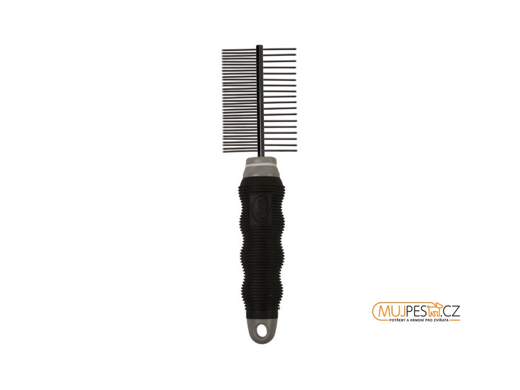 Oboustranný hřeben s kulatými zuby, které zabraňují podráždění pokožky psa. Z jedné strany jsou zuby husté a z druhé jsou středně husté zuby.