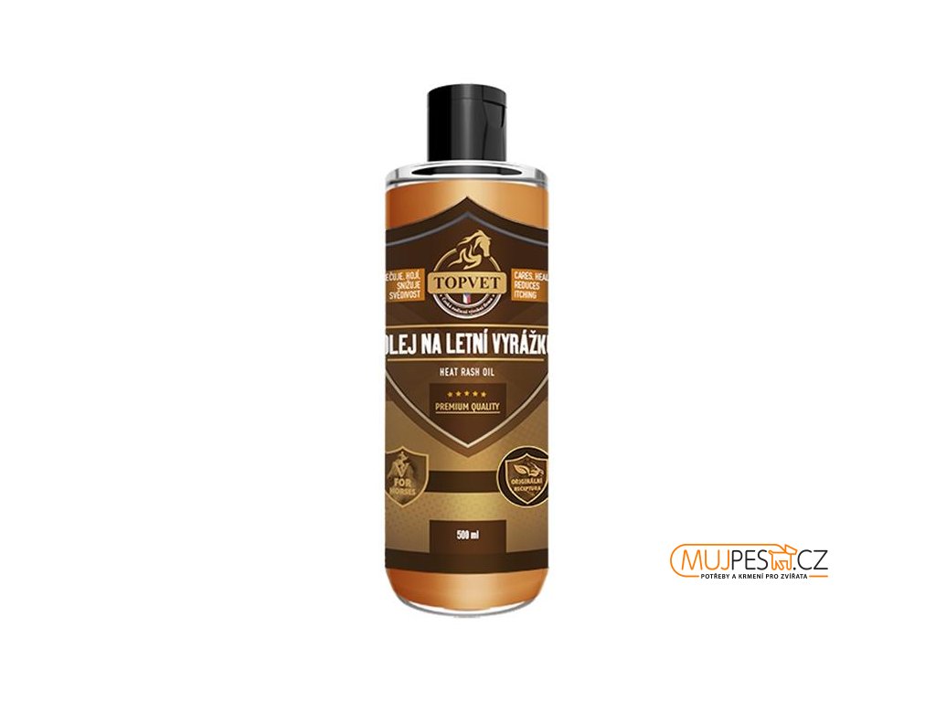 Olej na letní vyrážku je určený pro koně s kožními problémy. Originální receptura pokožku vyživuje, hydratuje a chrání před vnějším prostředím. Bylinná kompozice pokožku zvláčňuje, snižuje svědivost a obnovuje elasticitu. Olej vykazuje dlouhodobý účinek.