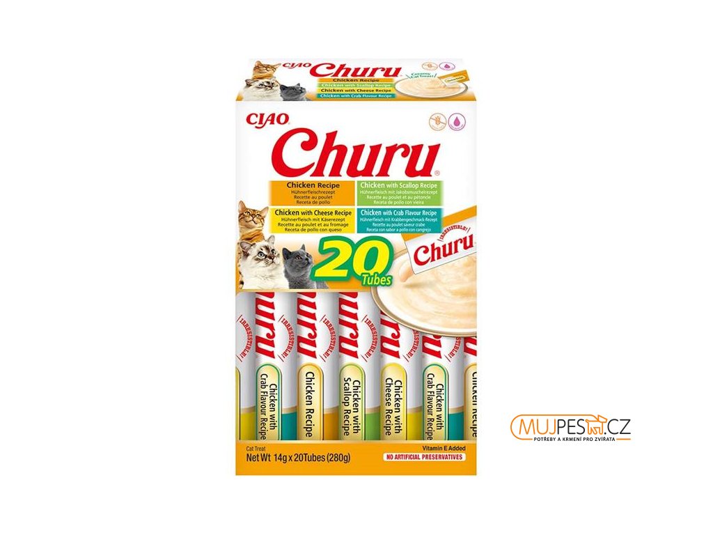 Výběr krémových pamlsků Churu ve variaci s kuřetem. Balení obsahuje celkem 20 pamlsků: 5x kuřecí, 5x kuřecí s hřebenatkou, 5x kuřecí se sýrem a 5x kuřecí s krabí příchutí. Zdravé mlsání s nízkým obsahem kalorií, bez konzervantů, chemických aromat, bez barviv a umělých dochucovadel. Inovativní měkká konzistence pamlsku Churu vám umožní trávit společné chvíle s vaší kočičkou hravým a interaktivním způsobem. Kočičí pamlsky Churu mají vysoký obsah vody a díky tomu jsou vhodným doplňkem k suchému krmivu nebo pro kočky, které málo pijí. Pamlsky Churu jsou 100 % přírodní a zdravé mlsání pro kočičky všech věkových kategorií. Churu jsou ideální pro ukrytí tablety na odčervení či jiného léku, který je potřeba kočce nenásilně podat.