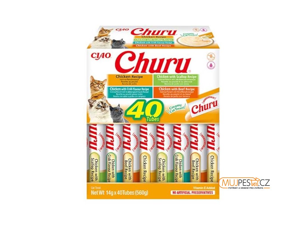 Výběr krémových pamlsků Churu s kuřetem. Balení obsahuje 40 pamlsků: 10× kuřecí, 10× kuřecí s hovězím, 10× kuřecí s hřebenatkou a 10× kuřecí s krabí příchutí.