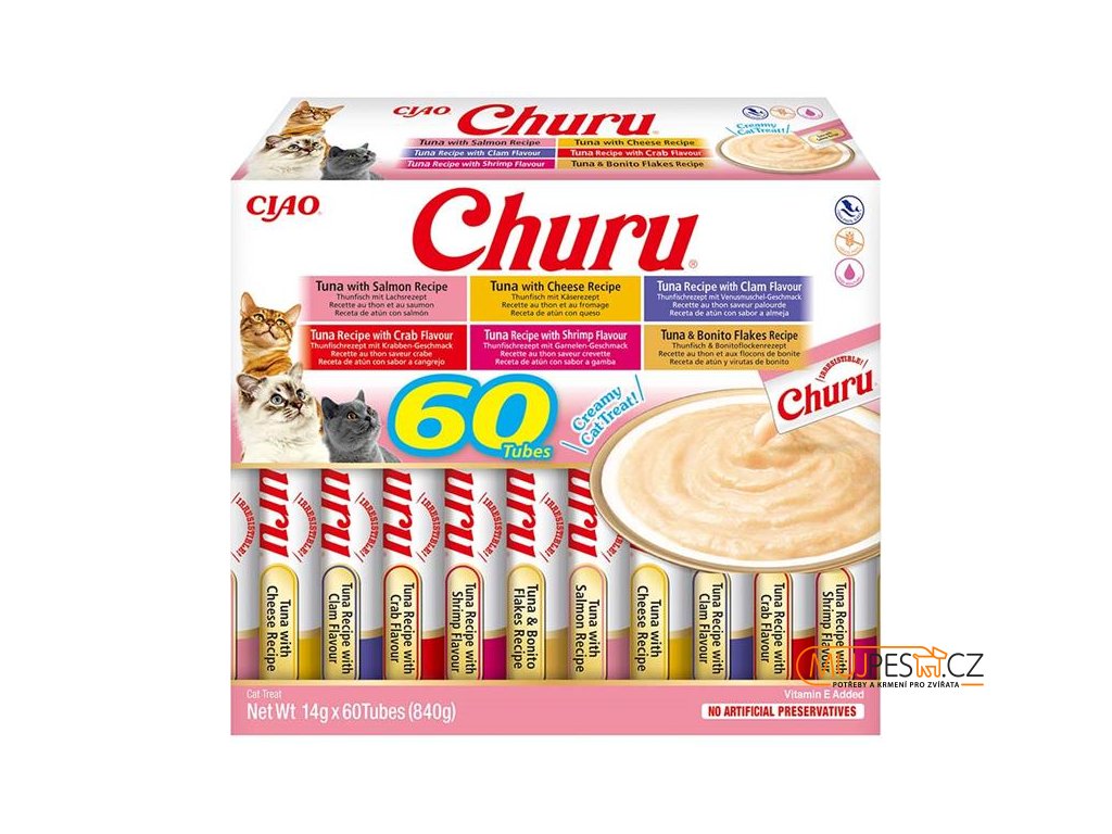 Výběr krémových pamlsků Churu ve variaci s tuňákem. Balení obsahuje celkem 60 pamlsků: 10x tuňák s lososem, 10x tuňák se sýrem, 10x tuňák s příchutí škeblí, 10x tuňák s vločky z tuňáka pruhovaného, 10x tuňák s příchutí kraba a 10x tuňák s příchutí krevet. Zdravé mlsání s nízkým obsahem kalorií, bez konzervantů, chemických aromat, bez barviv a umělých dochucovadel. Inovativní měkká konzistence pamlsku Churu vám umožní trávit společné chvíle s vaší kočičkou hravým a interaktivním způsobem. Kočičí pamlsky Churu mají vysoký obsah vody a díky tomu jsou vhodným doplňkem k suchému krmivu nebo pro kočky, které málo pijí. Pamlsky Churu jsou 100 % přírodní a zdravé mlsání pro kočičky všech věkových kategorií. Churu jsou ideální pro ukrytí tablety na odčervení či jiného léku, který je potřeba kočce nenásilně podat.
