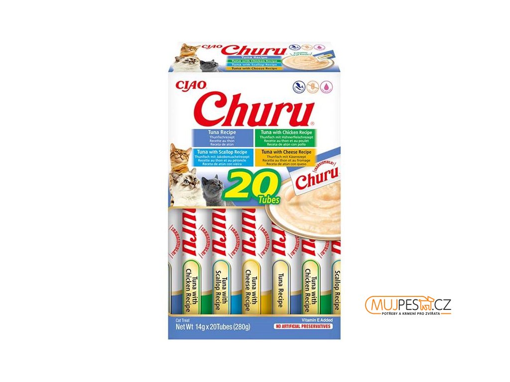 Výběr krémových pamlsků Churu ve variaci s tuňákem. Balení obsahuje celkem 20 pamlsků: 5x tuňáková receptura, 5x tuňák s kuřetem, 5x tuňák s hřebenatkou a 5x tuňák se sýrem. Zdravé mlsání s nízkým obsahem kalorií, bez konzervantů, chemických aromat, bez barviv a umělých dochucovadel. Inovativní měkká konzistence pamlsku Churu vám umožní trávit společné chvíle s vaší kočičkou hravým a interaktivním způsobem. Kočičí pamlsky Churu mají vysoký obsah vody a díky tomu jsou vhodným doplňkem k suchému krmivu nebo pro kočky, které málo pijí. Pamlsky Churu jsou 100 % přírodní a zdravé mlsání pro kočičky všech věkových kategorií. Churu jsou ideální pro ukrytí tablety na odčervení či jiného léku, který je potřeba kočce nenásilně podat.