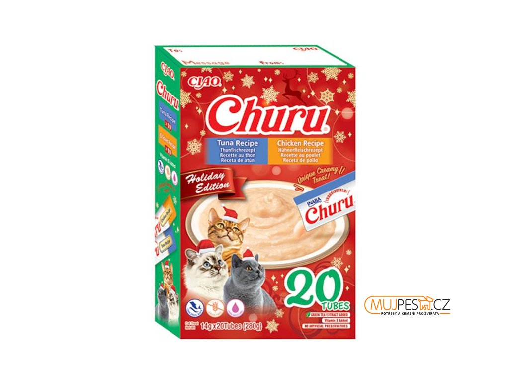 Dejte své kočce ten nejlepší vánoční dárek v podobě oblíbených krémových pamlsků Churu! Balení obsahuje celkem 20 pamlsků Churu: 10× kuře a 10× tuňák.