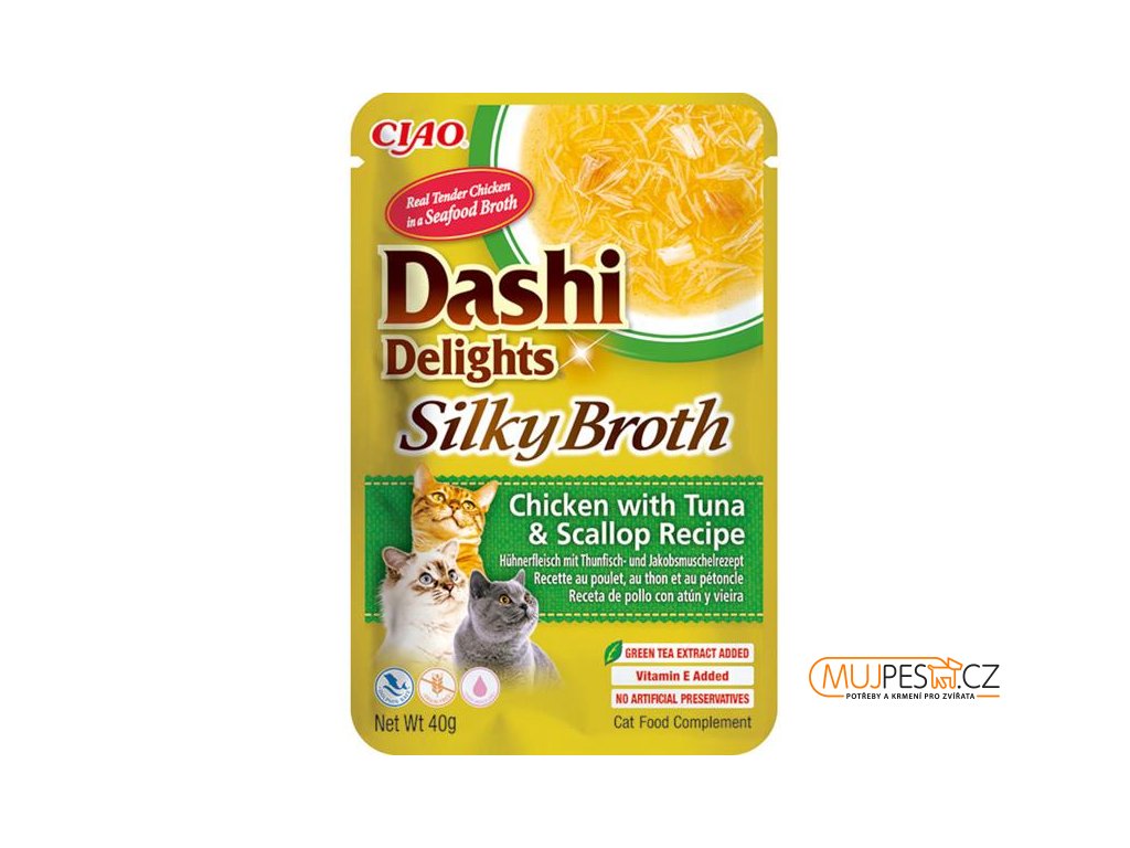 Kapsička obsahuje lahodný vývar z hřebenatky a tuňákových vloček doplněný o kousky kuřecího masa, tuňáka a hřebenatky. Daši je tradiční japonský rybí vývar z tuňákových vloček bonito známý svou výjimečně lahodnou chutí. Jeho zařazení do jídelníčku vaší kočky může dodat krmení nový rozměr a učinit z něj skutečný zážitek. Daši navíc poskytuje důležité živiny včetně vitamínů a minerálů a díky nízkému obsahu kalorií a tuku je zdravým doplňkem stravy. Je to produkt na bázi vývaru, obsahuje tedy vysoké množství vody, čímž přispívá k hydrataci organismu a k prevenci potíží močového ústrojí.