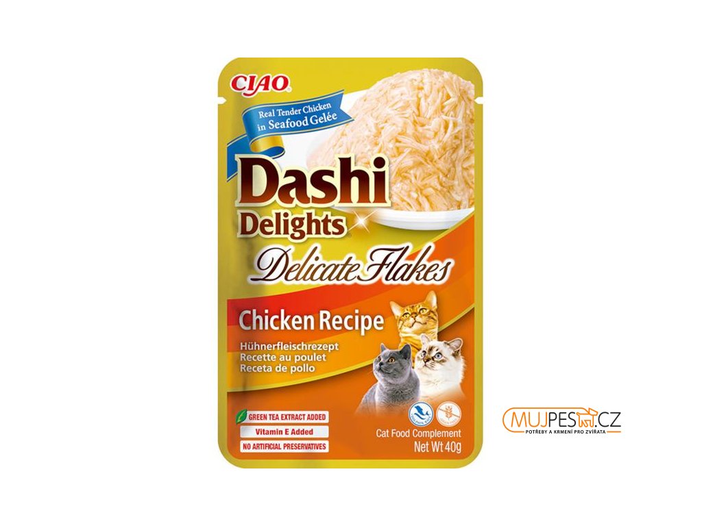 Lahodná kuřecí kapsička obsahuje jemné kuřecí maso smíchané s vývarem z hřebenatky a japonským vývarem daši. Daši je tradiční japonský rybí vývar z tuňákových vloček bonito známý svou výjimečně lahodnou chutí. Jeho zařazení do jídelníčku vaší kočky může dodat krmení nový rozměr a učinit z něj skutečný zážitek. Daši navíc poskytuje důležité živiny včetně vitamínů a minerálů a díky nízkému obsahu kalorií a tuku je zdravým doplňkem stravy. Je to produkt na bázi vývaru, obsahuje tedy vysoké množství vody, čímž přispívá k hydrataci organismu a k prevenci potíží močového ústrojí.