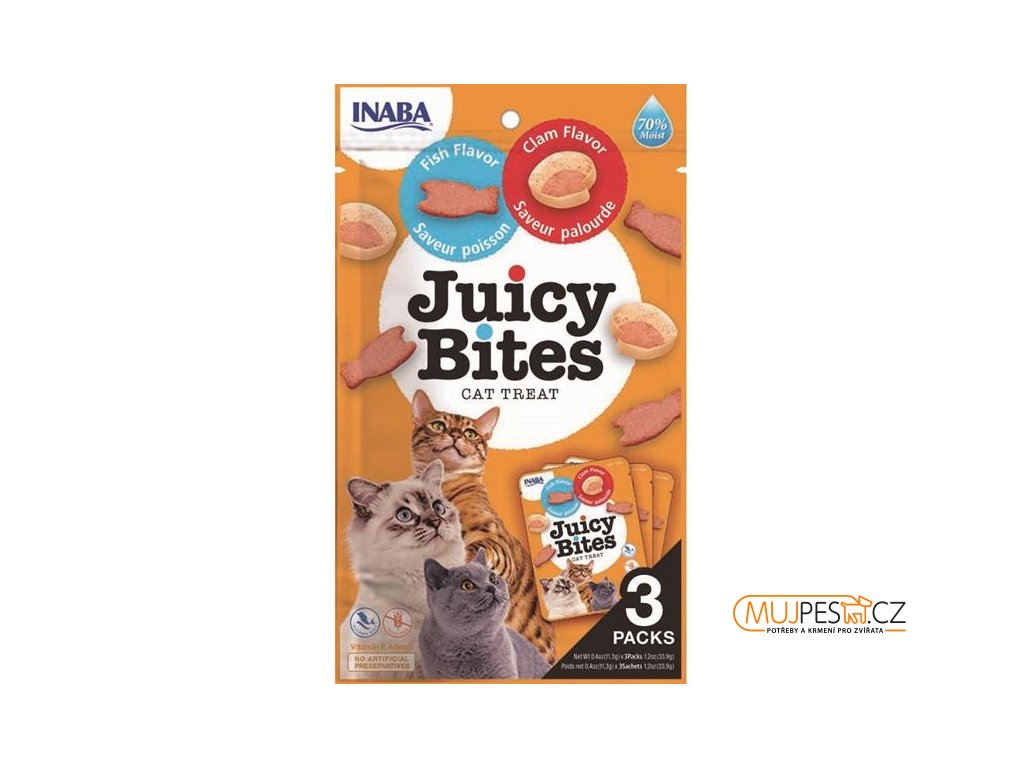 Pamlsky Inaba Juicy Bites ve dvou příchutích – ryba a škeble – jsou vláčné, měkké, přirozeně chutné a hlavně zdravé. Vyrobeny jsou z pravého tuňáka a kuřat chovaných na farmách, mají nízký obsah kalorií a neobsahují obiloviny, konzervanty ani umělá barviva. Pro kočky mají ideální velikost a pro radost všech zúčastněných zábavné tvary.