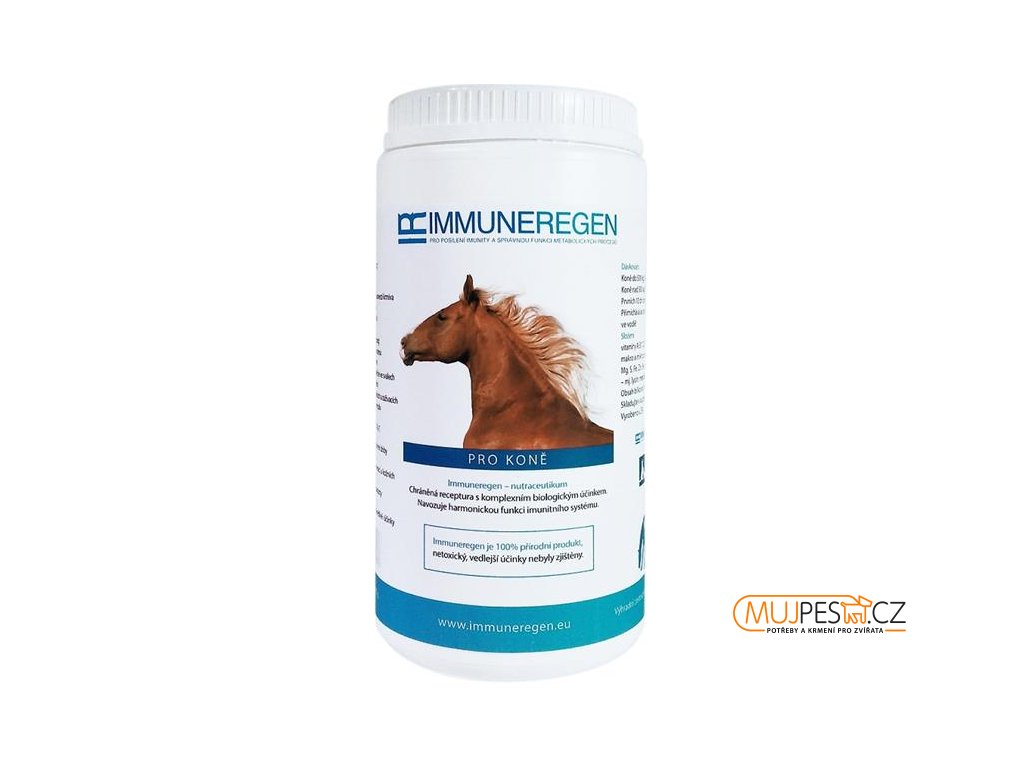 Immuneregen pro koně - biopreparát s komplexním biologickým účinkem. Aktivuje imunitní mechanismy - navozuje správnou funkci imunitního systému a harmonický běh metabolických procesů. Má silné protizánětlivé a antioxidační účinky, aktivuje regenerační procesy všech orgánových systémů.