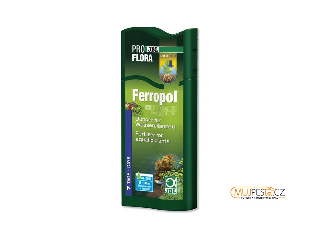 Univerzální tekuté hnojivo pro všechny druhy zelených akvarijních rostlin dávkované do vody v akváriu a rostlinami přijímané prostřednictvím listů, ale i kořenů (poté co hnojivo absorbuje substrát). Dodává akvarijním rostlinám potřebné minerály a v neposlední řadě pro chlorofyl nepostradatelné železo. Železo, které je obsaženo v přípravku JBL Ferropol je navíc v chelátové formě, což brání jeho volné oxidaci.