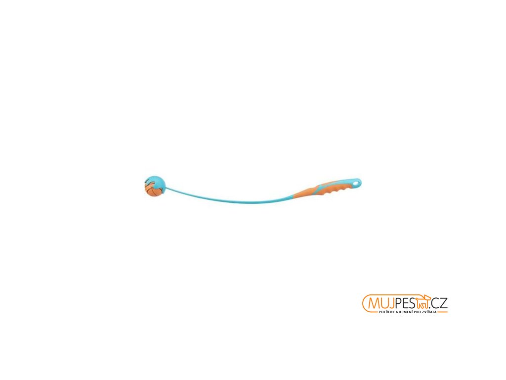 Propracovaný katapult s ergonomicky tvarovanou rukojetí potaženou gumou pro pevné a pohodlné držení. Dodáván ve veselých barevných odstínech růžové a modré. Míček je vyroben z lehké pěnové gumy, takže se hodí i pro aportování ve vodě.
