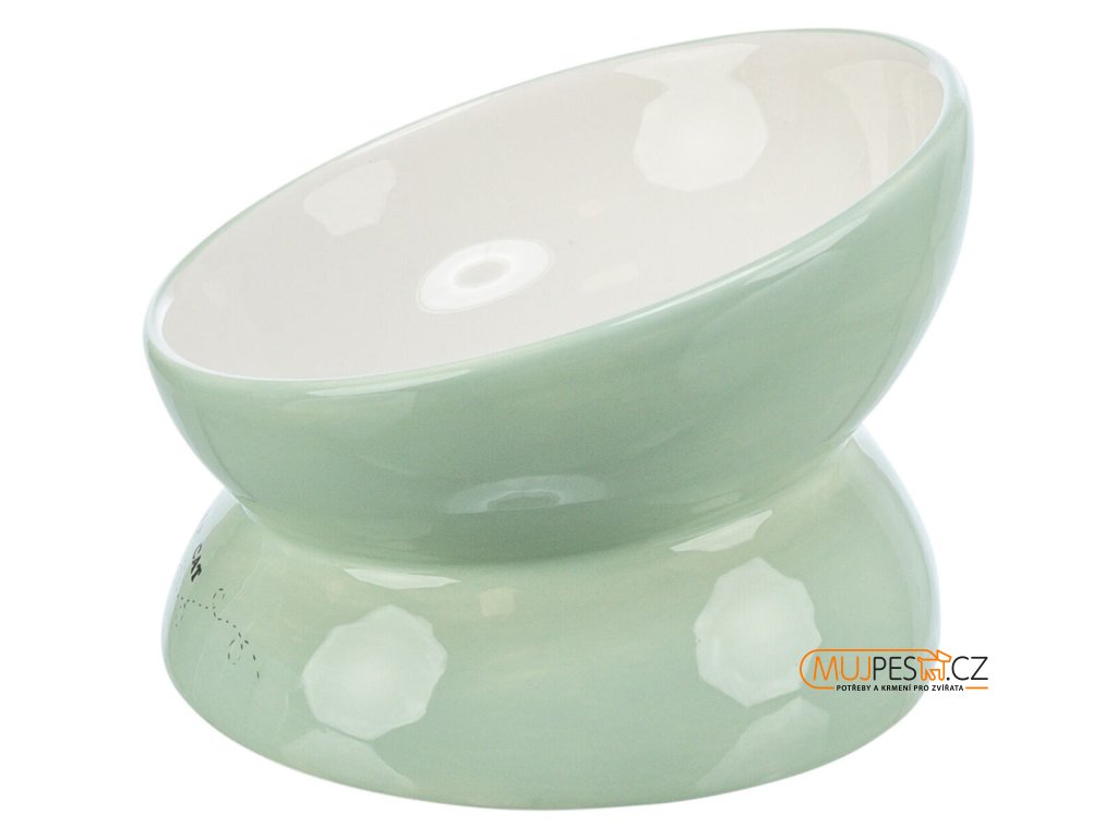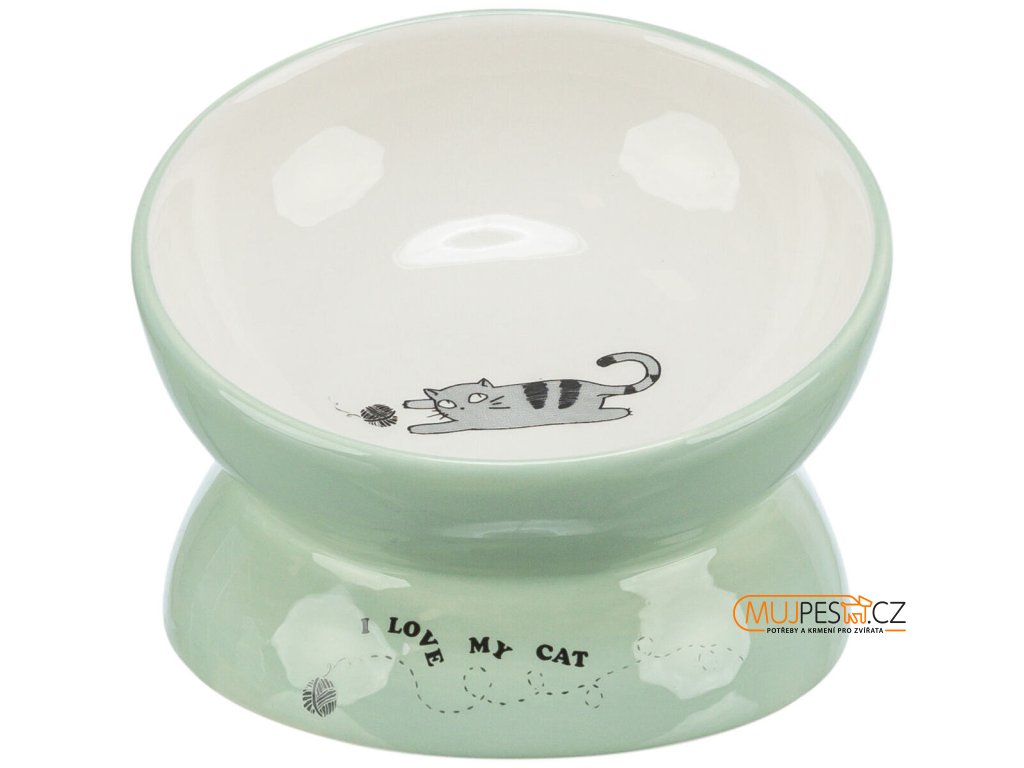 Keramická miska vyvýšená s motivem kočky, ergonomický tvar, 0,15 l / 13 cm, šalvěj/bílá