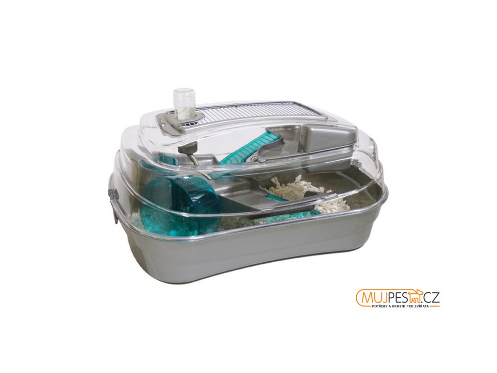 Plně zařízená plastová klec pro drobné druhy křečků a myší.