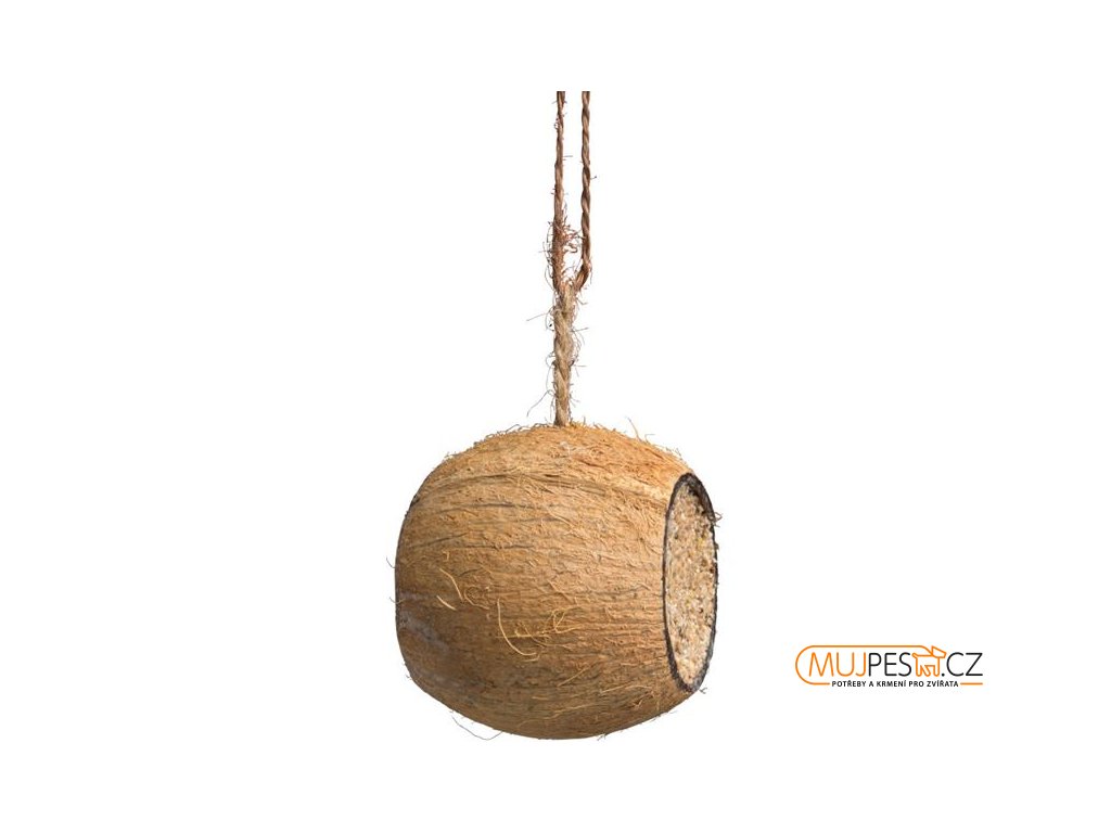 Kokosová skořápka plněná hovězím lojem může po vyprázdnění posloužit jako přírodní krmítko.