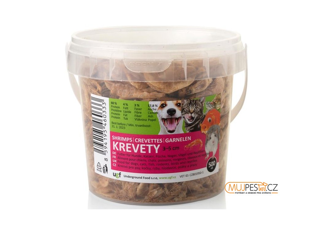 Sušené krevety o velikosti 3–5 cm jsou čistě přírodní doplňkové krmivo určené pro psy, kočky, plazy, ryby (zejména koi kapry), ptáky a hlodavce. Jde o produkt s vysokým obsahem vysoce kvalitního a lehce stravitelného proteinu (60 %), omega-3 nenasycených mastných kyselin, vápníku a vitamínů. Ve výživě psů a koček jsou vhodné jako pamlsek, doplněk běžné potravy zvířat, ale také jako součást potravy při krmení syrovou stravou BARF. Krevety mohou hrát ve výživě psů a koček významnou roli jako doplňující zdroj širokého spektra vysoce stravitelných živin (minerálů, vitamínů, antioxidantů, aminokyselin a mastných kyselin). Podporují imunitní systém, kloubní systém, zdraví kůže a kvalitu srsti. Krevety jsou také velmi oblíbené u mořských a suchozemských želv. Ty z nich získávají důležité tuky, které jim v běžné potravě často chybí.