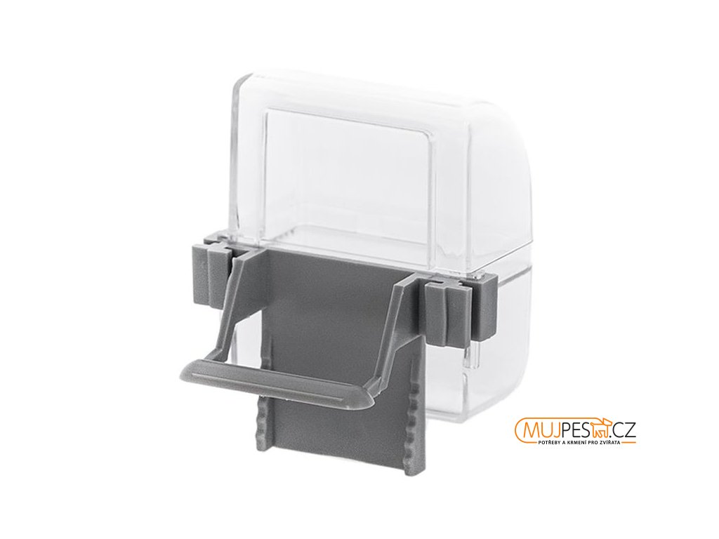 Plastové krmítko do ptačích klecí s otvory na krmítka. Držák pro uchycení ke kleci s bidýlkem + zásobník na krmivo.