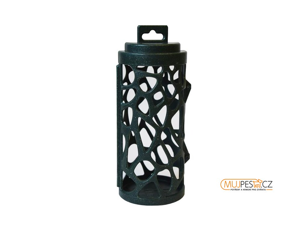Plastové krmítko vyrobené z recyklovaného plastu pro snadné krmení volně žijícího ptactva lojovými koulemi.