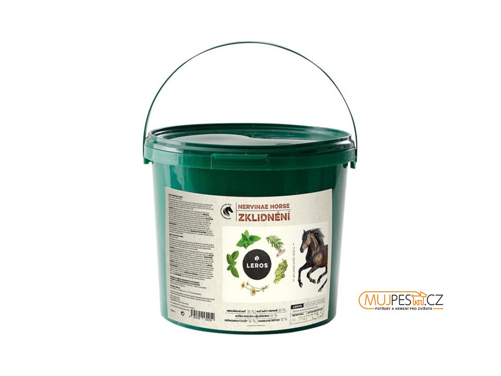 Bylinná směs Nervinae Horse Zklidnění napomáhá uklidnit koně při nervovém vyčerpání, při podrážděnosti a napětí, při nepřiměřené reakci na rušivé podněty nebo při rekonvalescenci po lékařském zákroku. Vhodná podpora před stresovými situacemi a během nich, při změně prostředí a začleňování koně do stáda. Zlepšuje soustředění, zmírňuje strach a úlekové reakce. Čistě přírodní složení bez obsahu konzervantů, lepku a umělých sladidel.