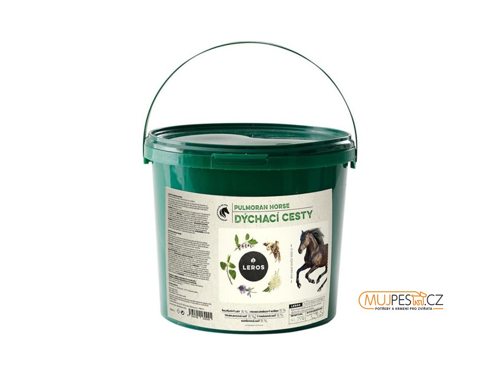 Bylinná průdušková směs Pulmoran Horse Dýchací cesty podporuje dýchací ústrojí koní a příznivě ovlivňuje léčbu kašle, zánětu průdušek i dýchacích cest, alergií a rýmy. Účinně rozpouští hleny a usnadňuje vykašlávání. Vhodné pro koně trpící astmatem. Zmírňuje alergické reakce na prach a seno. Čistě přírodní složení bez obsahu konzervantů, lepku a umělých sladidel.