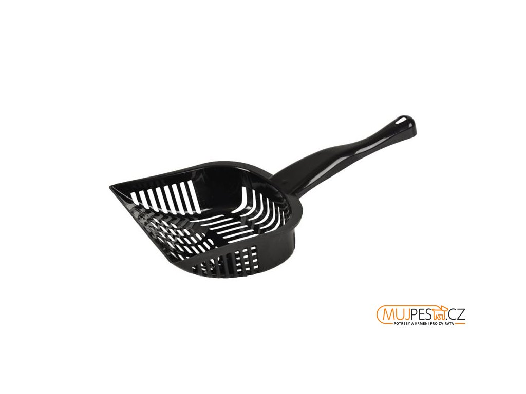 Praktická plastová lopatka k odstraňování trusu z kočičích toalet. Široký okraj lopatky umožňuje snadné vyjmutí nečistot z podestýlky.