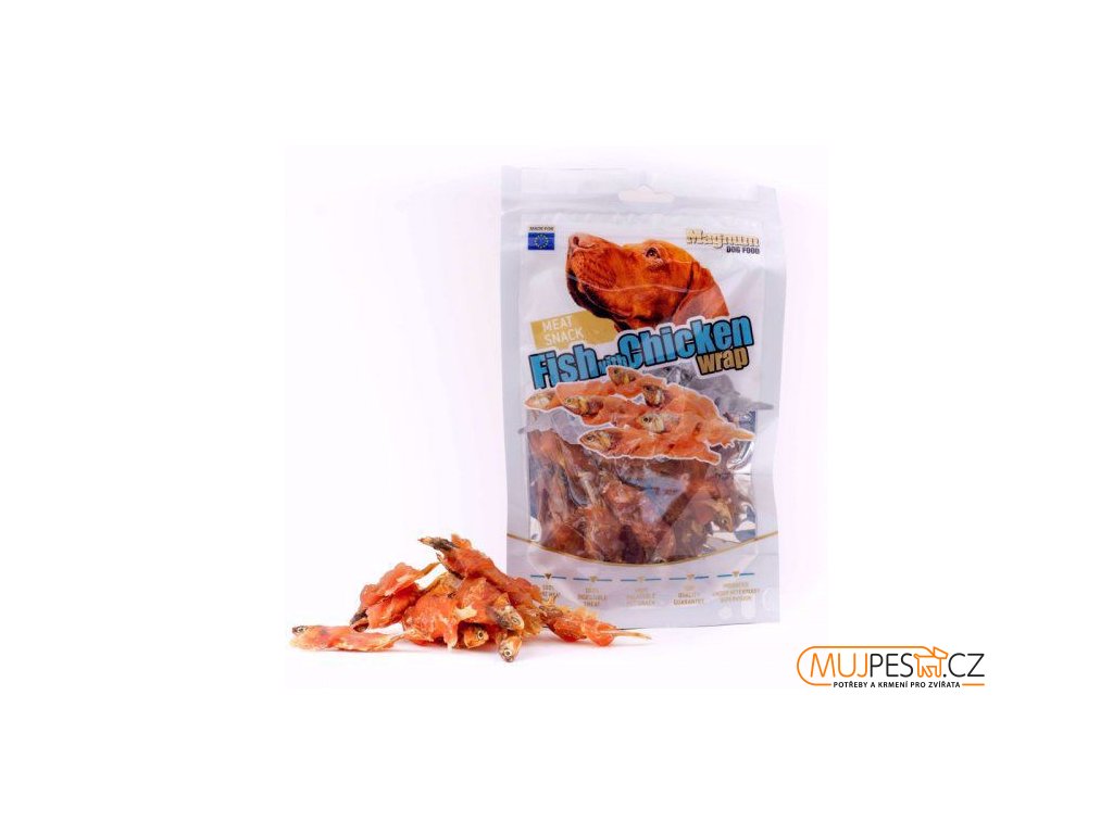 Měkká, přírodní masová pochoutka pro psy. Sušená rybka omotaná proužkem kuřecí svaloviny.