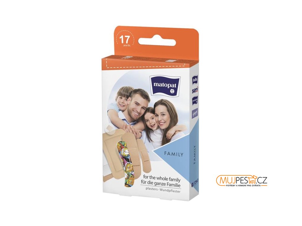Sada náplastí Family je svou skladbou přizpůsobená potřebám všech členů rodiny. Balení obsahuje 17 ks náplastí (Universal, Happy, Aqua Stop, Transparent, Soft a Classic) v šesti velikostech. Ideální k ochraně malých ran, škrábanců, puchýřů a odřenin.