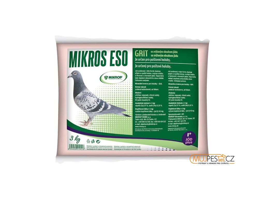 MIKROP ESO Grit I se zvýšeným obsahem jódu pro poštovní holuby je určen pro podporu trávení, zlepšuje příjem a využití krmiva, zvyšuje snášku a líhnivost u chovných párů. Napomáhá také zlepšení zdravotního stavu mláďat. Vyrábí se z přírodních, ekologicky čistých surovin, svojí hrubou strukturou napomáhá rozmělnění potravy ve voleti a tím zvyšuje využitelnost přijímaného krmiva. Vysokým obsahem vápníku příznivě působí na tvorbu vaječné skořápky a kostní tkáně. Je nezbytný v době odchovu a přepeřování jako zdroj minerálních látek (Ca, P).