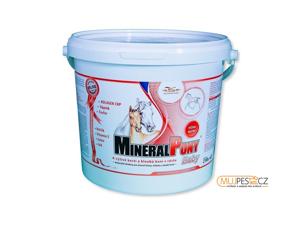 Minerální doplňkové krmivo s obsahem kolagenu CHP, základních minerálních látek, vitamínu E, selenu, jódu, vitamínu C a beta-karotenu určené pro intenzivní výživu a vývoj skeletu hříbat a mladých koní a pro výživu a ochranu skeletu hřebných a kojících klisen.