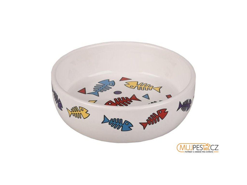 Keramická kulatá miska pro kočky s potiskem rybiček.