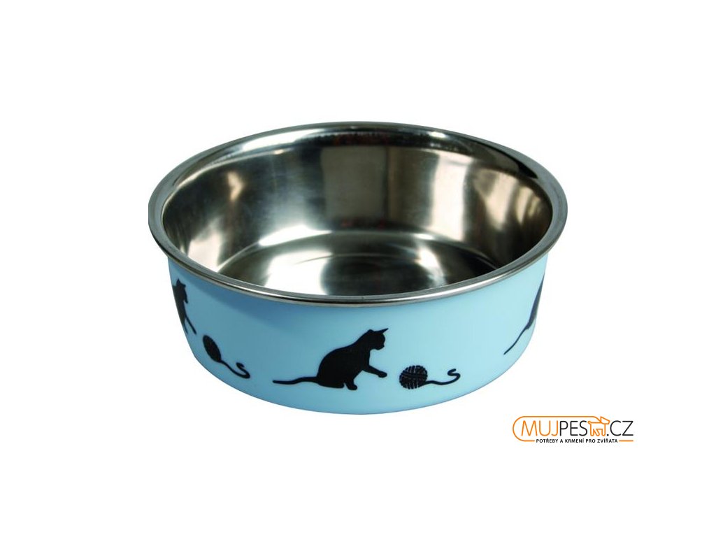 Vnější část misky barevná s matnou úpravou a obrázkem hrající se kočičky s klubíčkem.