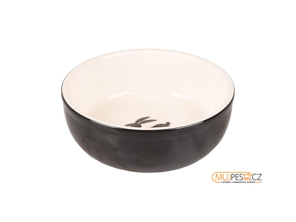 Keramická miska béžové barvy s černými komponenty pro drobné savce s obrázkem králíka.