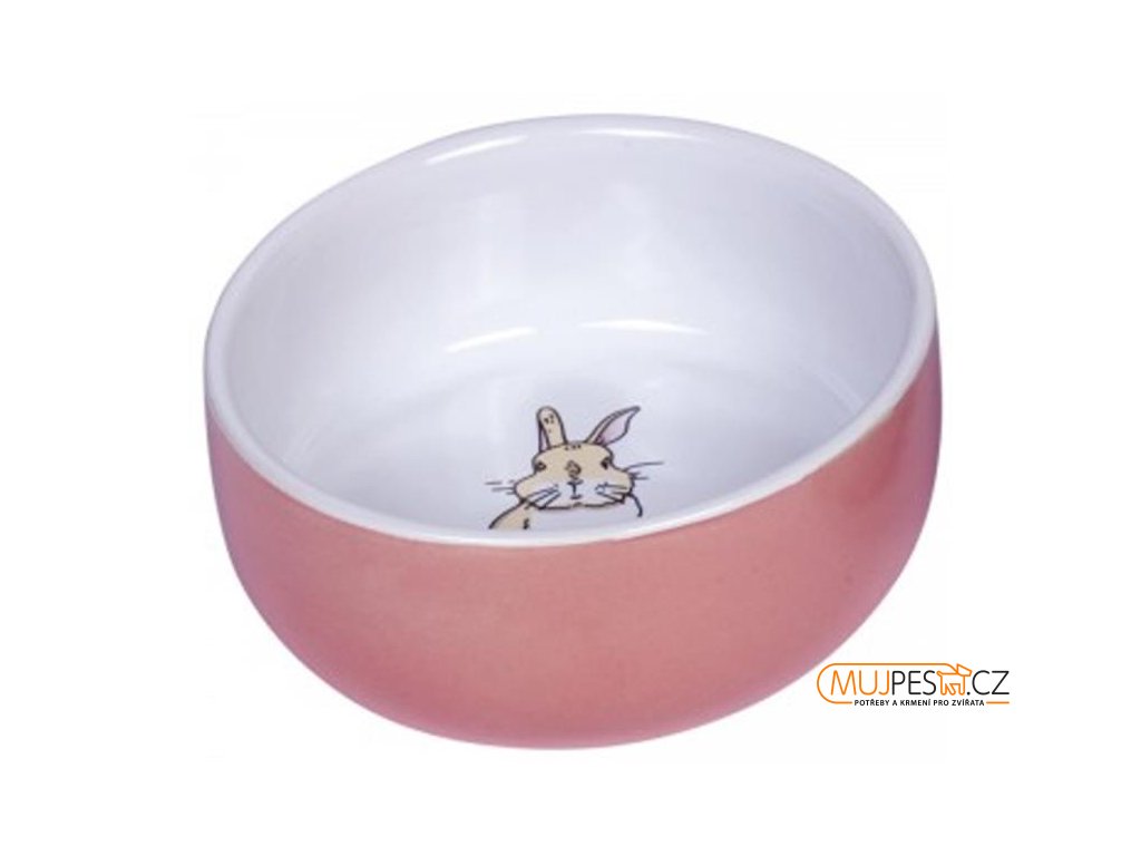Keramická miska světle červené barvy. Vnitřní část misky bílá s obrázkem.