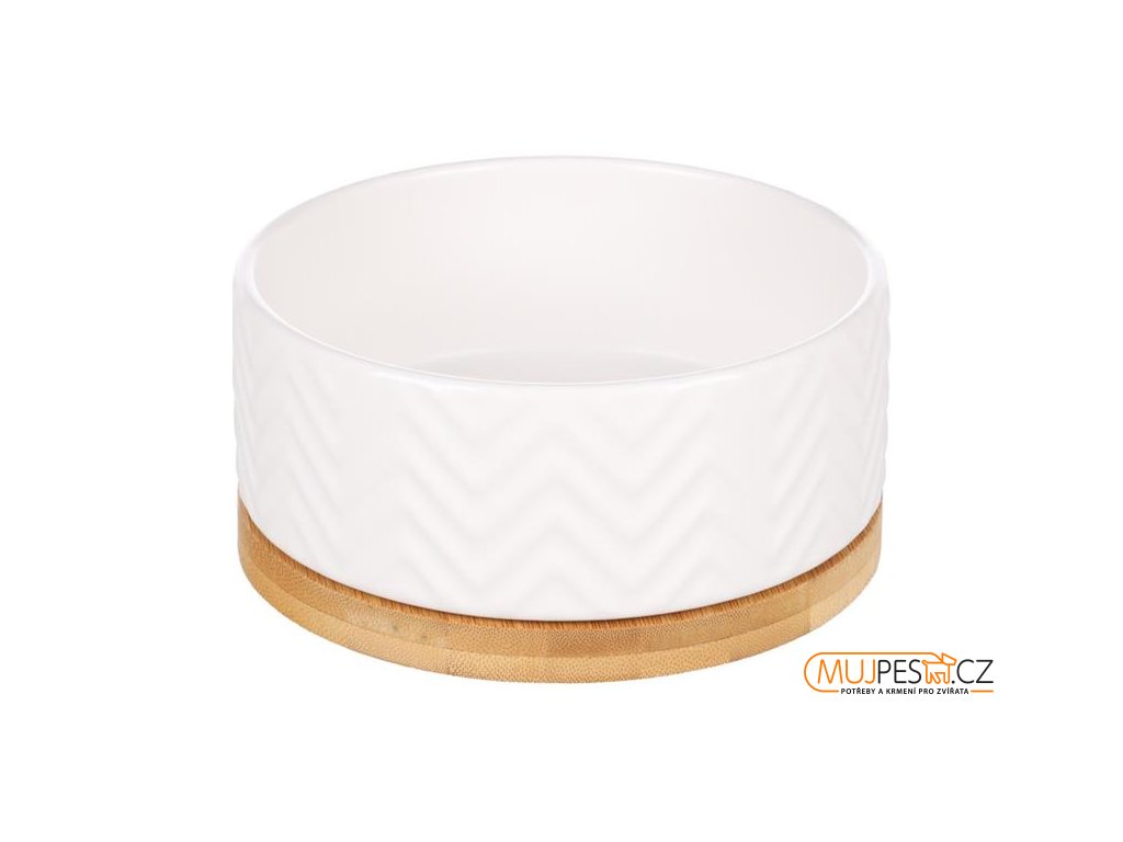 Elegantní nádoba na suché i vlhké krmivo nebo na vodu se skládá ze dvou částí: glazovaná keramická miska je vložená do bambusového podkladu. Miska má protiskluzové dno a její keramickou část lze mýt v myčce na nádobí.